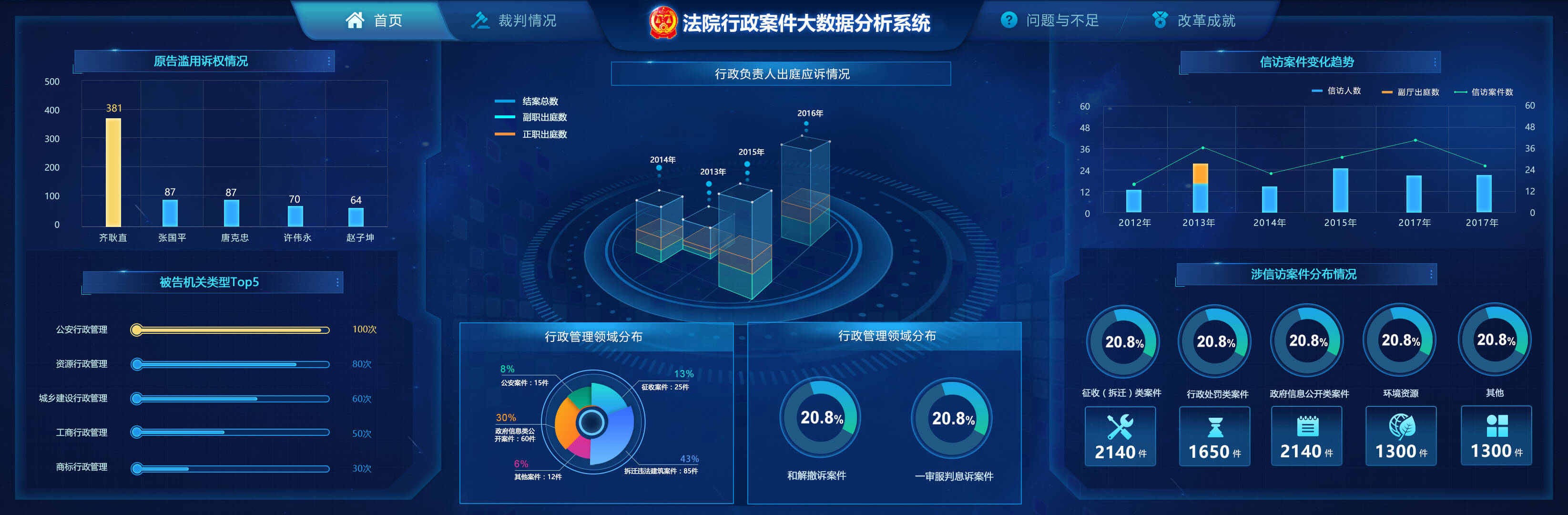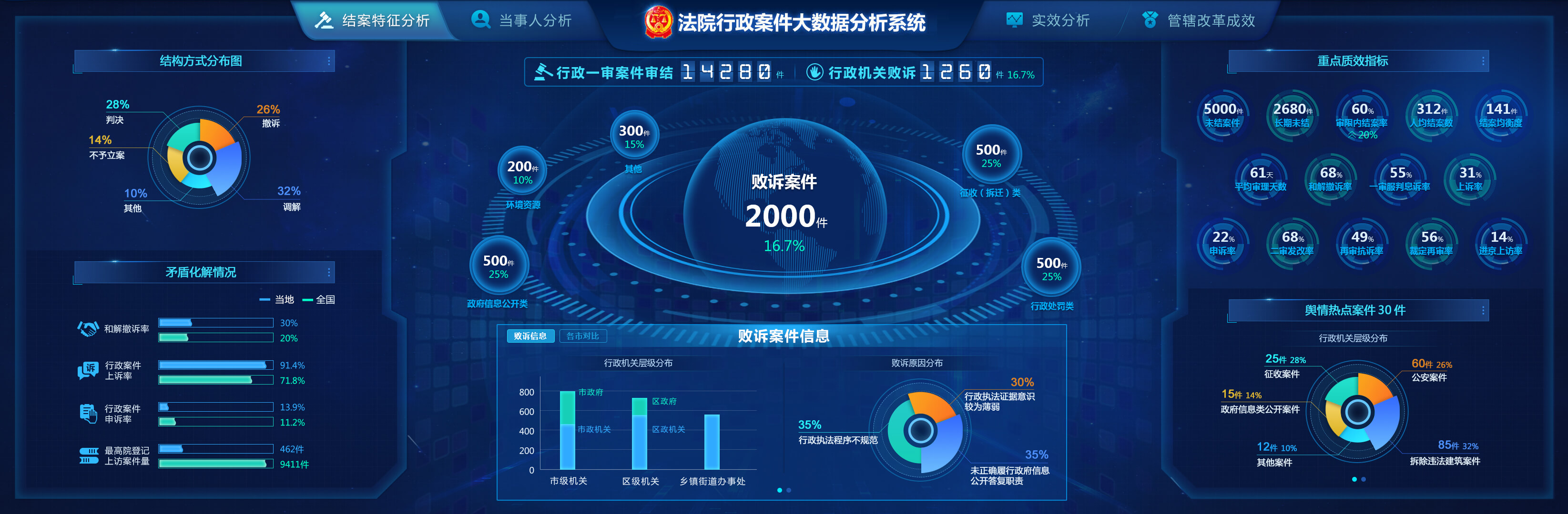 法院行政案件大數(shù)據(jù)分析系統(tǒng)包含了結(jié)案特征分析、當事人分析、實效分析和管轄改革成效。通過收案/結(jié)案的數(shù)量和增幅,分別用時間、領(lǐng)域、地區(qū)等維度分析案件變化趨勢,從結(jié)構(gòu)方式、矛盾化解情況、重點質(zhì)效指標、輿情熱點案件、敗訴案件和敗訴案件信息來分析結(jié)案特征,用信訪案件變化趨勢和分布情況針對機關(guān)濫用職權(quán)情況來特別分析。不同分析角度分析不同數(shù)據(jù),實現(xiàn)案件大數(shù)據(jù)全方位解讀。