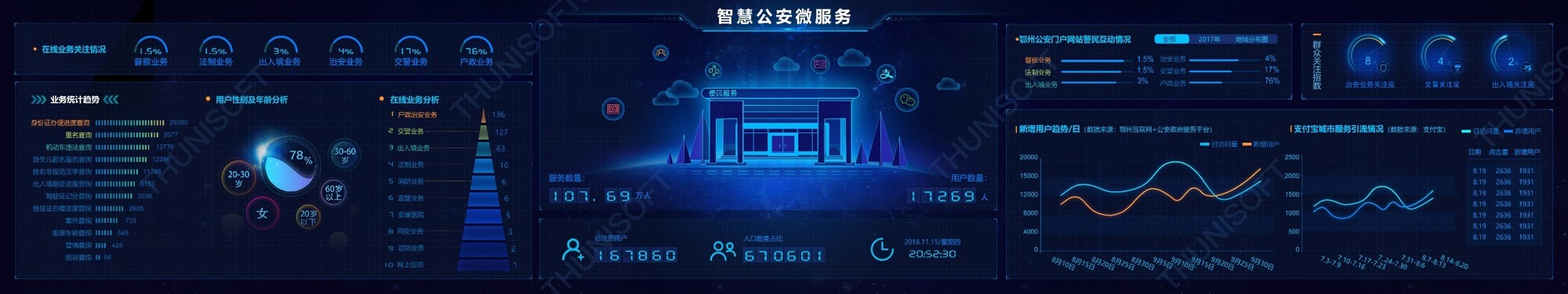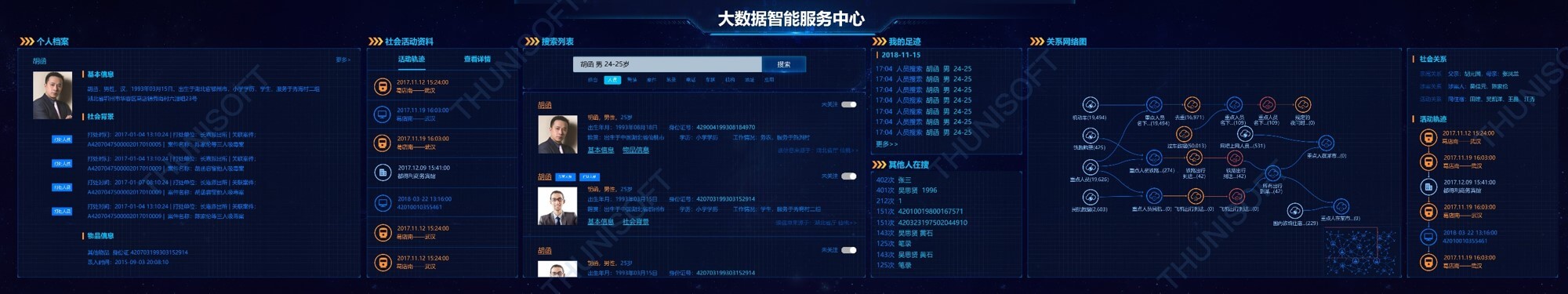 智慧公安實戰(zhàn)應(yīng)用包括了智慧搜索、智慧建模、智慧服務(wù)、智慧監(jiān)督、智慧標簽、智慧小區(qū)、智慧管控以及智慧監(jiān)測,實現(xiàn)個人檔案的查詢,同時關(guān)聯(lián)社會關(guān)系和活動軌跡并繪制出關(guān)系網(wǎng)絡(luò)圖,通過建模顯示各模型使用情況和資源訪問量、訪問趨勢,進行在線業(yè)務(wù)分析,各類警務(wù)案件指標分析,根據(jù)標簽標準生成人員畫像,通過重點人員異常軌跡進行警情監(jiān)測,根據(jù)熱點追蹤進行傳播路徑分析,實現(xiàn)公安智慧化管理。