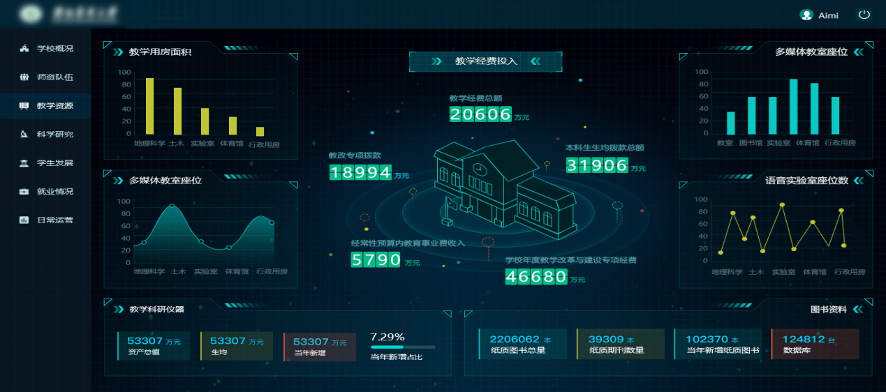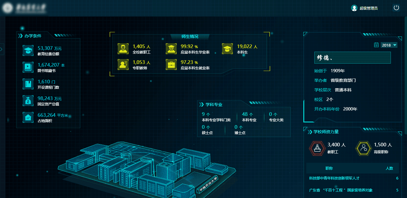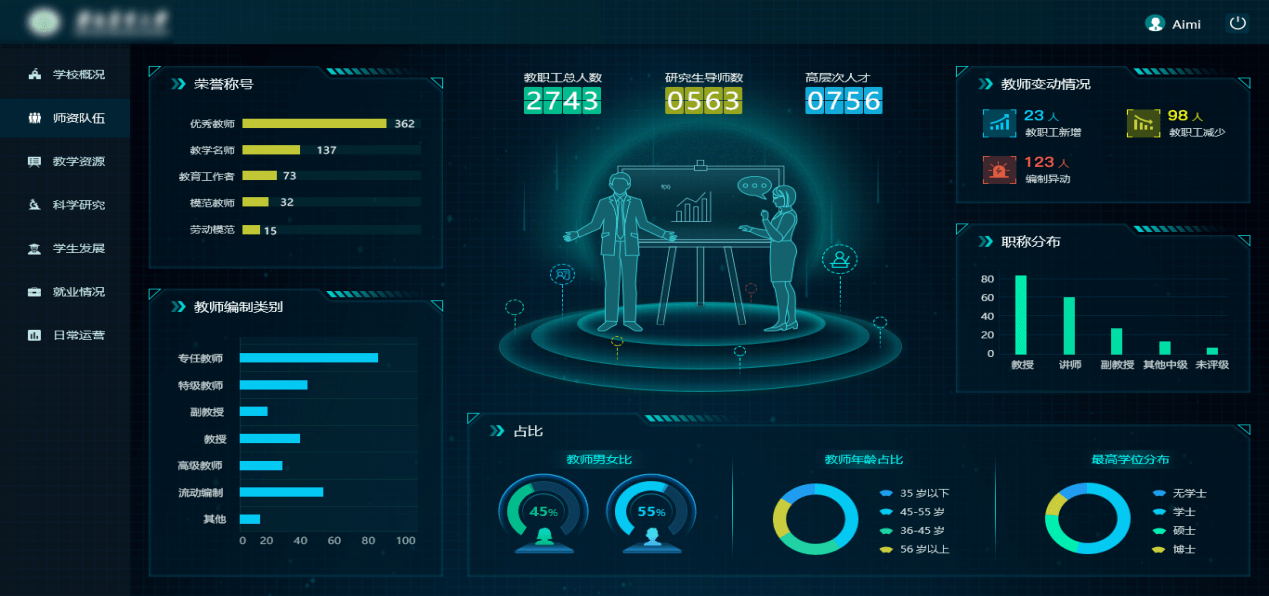 為了展現(xiàn)學校的實力,分別從學校概況、師資隊伍、教學資源、科學研究、學生發(fā)展、就業(yè)情況和日常運營的角度來展示。學校概況包括辦學條件、師生情況、學科專業(yè)和師資力量,再通過榮譽稱號、教師編制類別、教職工人數(shù)、研究生導(dǎo)師數(shù)、高層次人才、職稱分布、最高學位分布等展示師資隊伍,用教學用房面積、教學經(jīng)費投入、教學科研儀器、圖書資料等來表現(xiàn)教學資源,用著作成果、獲獎成果、論文與專利等展現(xiàn)科學研究。