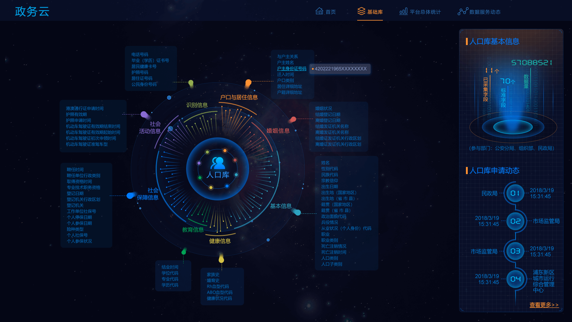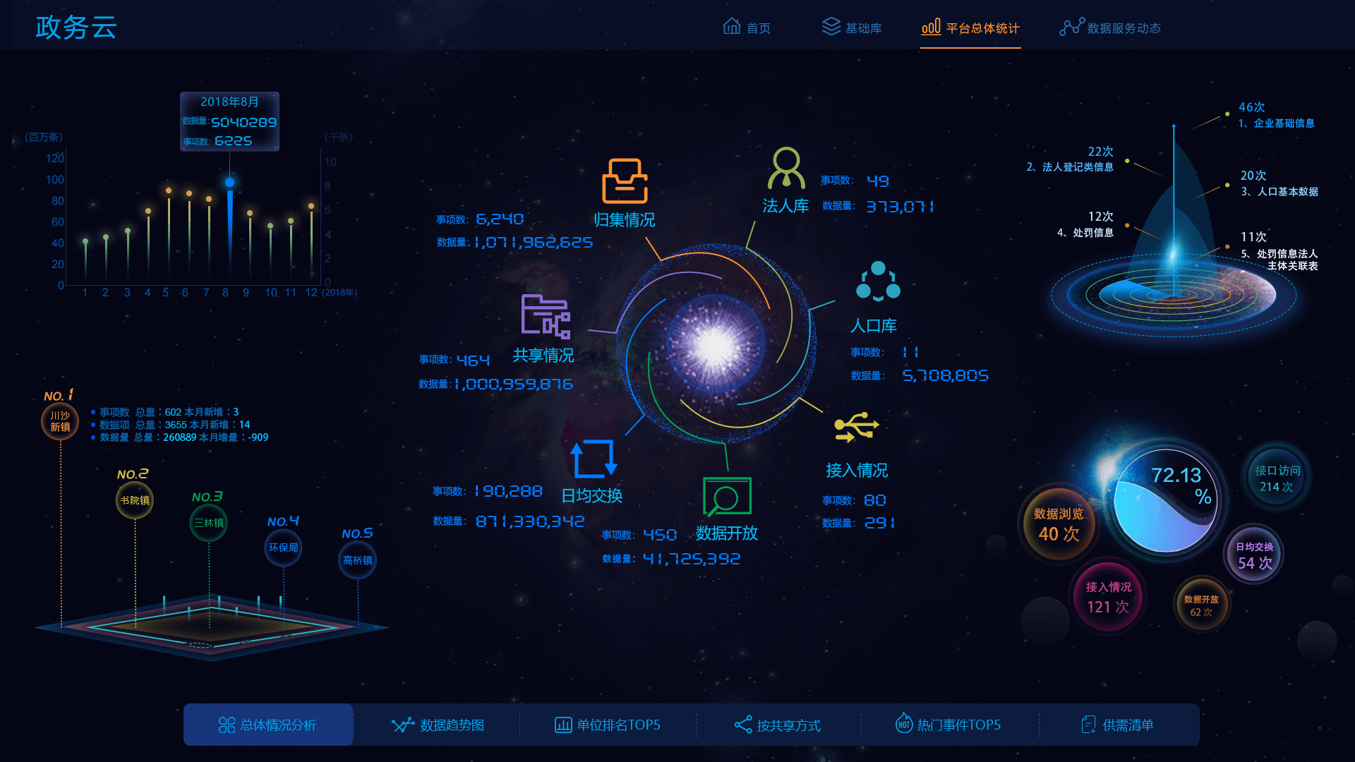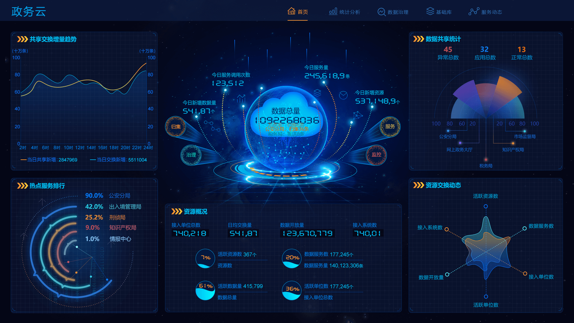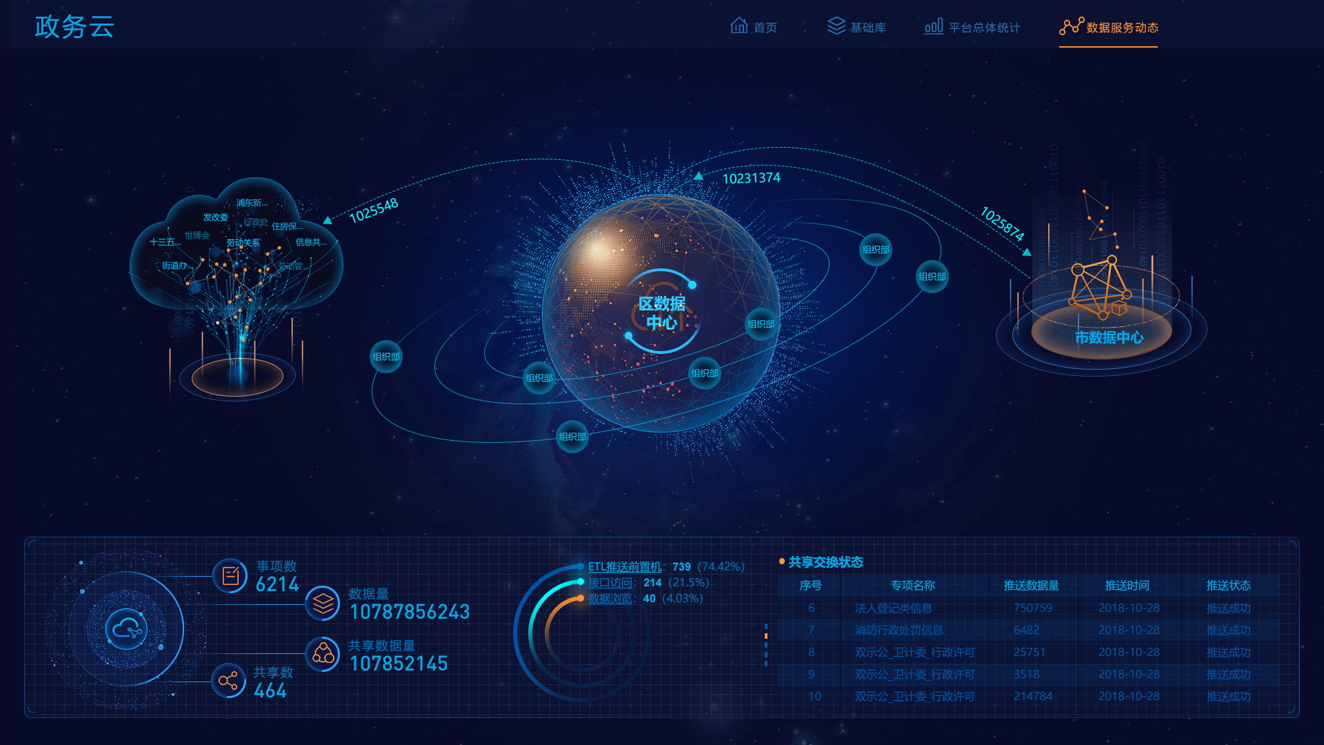 首頁展示共享方式占比、共享屬性占比、數(shù)據(jù)趨勢、熱門事項、和單位排名等,基礎(chǔ)庫包括人口庫、法人庫,支持搜索刷新,同時展示庫的基本信息和申請動態(tài),平臺總體統(tǒng)計展示平臺各類指標數(shù)據(jù)的訪問、更新情況,數(shù)據(jù)服務(wù)動態(tài)展現(xiàn)區(qū)數(shù)據(jù)中心和市數(shù)據(jù)中心等的數(shù)據(jù)實時交互狀況,實現(xiàn)數(shù)據(jù)全方位全時段把控。